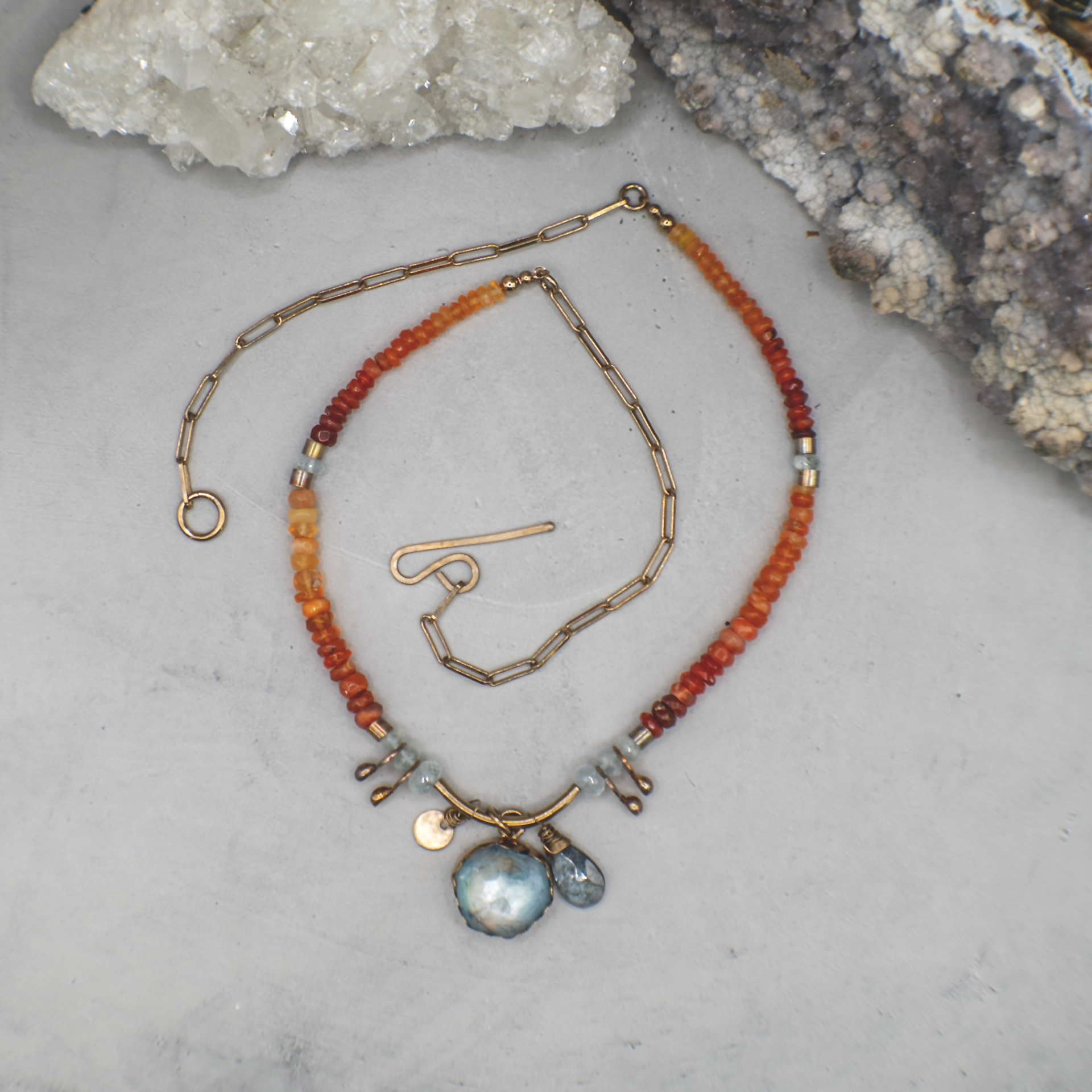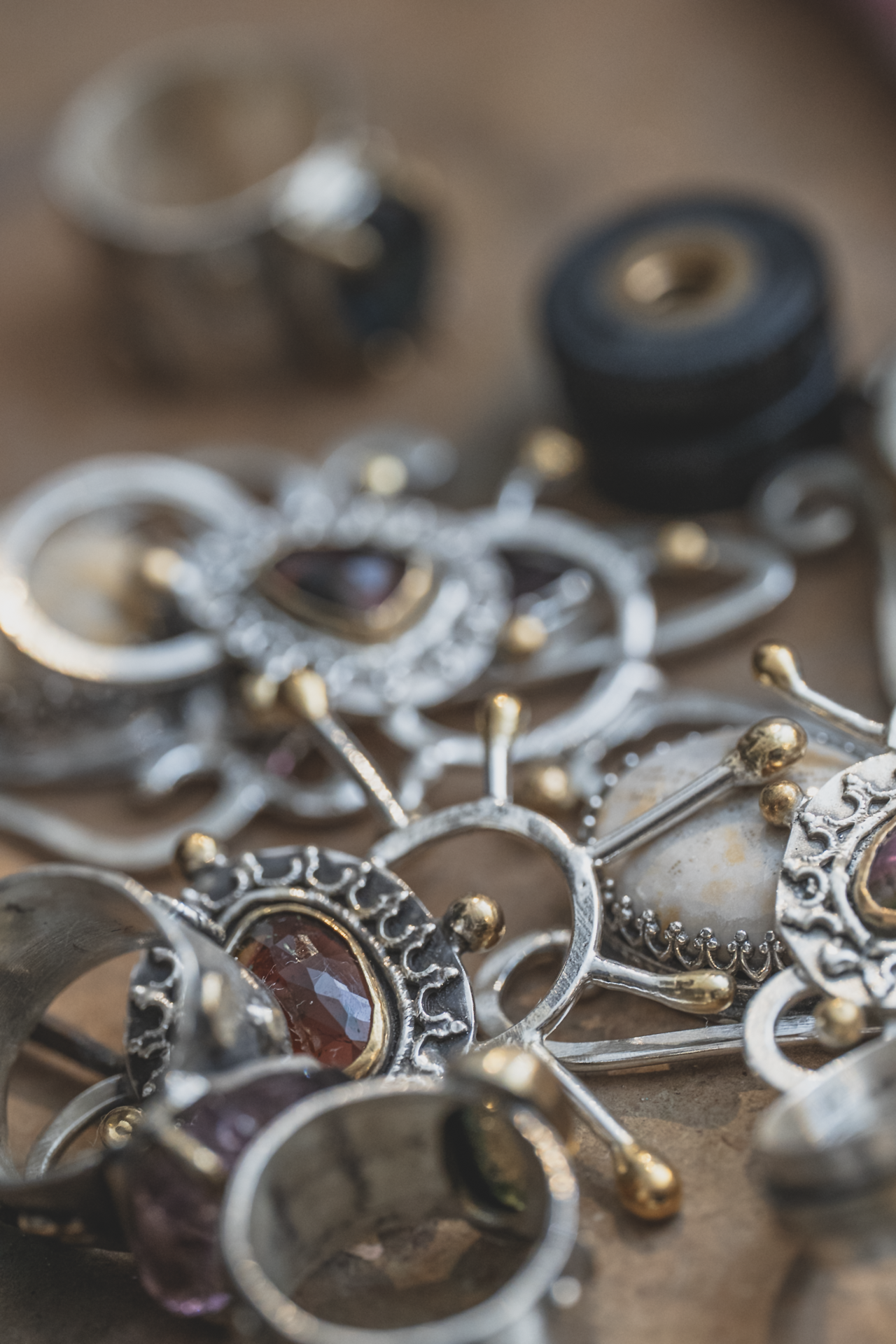 Each piece begins as something found—stone, texture, memory. I work with natural inclusions, hand-cut stones, and recycled metals to create jewelry that feels like it has lived before you found it. No two are ever the same.
