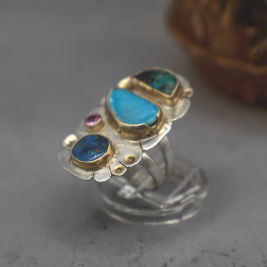 Electric Coral I - Kingman Turquoise, Boulder Opal, 24K Gold and Silver Ring