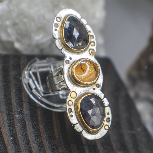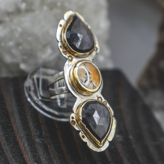 Shadow Lantern Ring II - Metallic Sapphire, Dendritic Quartz, 24K Gold and Silver Ring